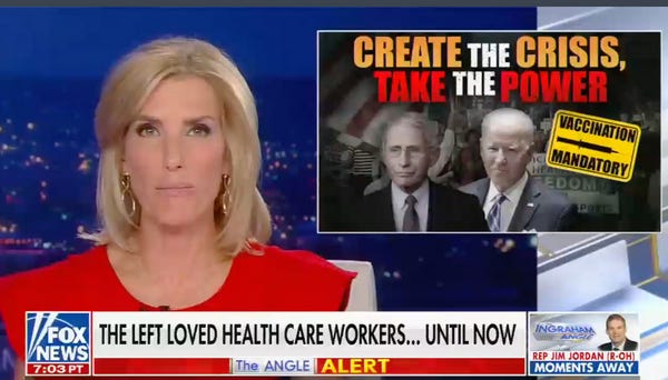 It slowly becomes clear what Ingraham's angle is here: The godless Left “claimed" to love frontline health care workers until we ditched them like our geeky friend in high school. We've suddenly turned on health care workers because we want them to get vaccinated against the same virus that they valiantly fought last year. This doesn't seem like an unreasonable request, but Ingraham disagrees.