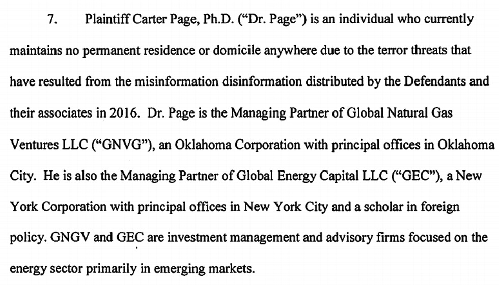 Also, you can't be a private person and simultaneously the foreign policy advisor to a major presidential campaign. Carter Page might wish to avail himself of the lower defamation standard for public persons, and we might wish that we could get back the thirty minutes we spent reading this dreck, but we're all shit outta luck, or SLO in Pagespeak.