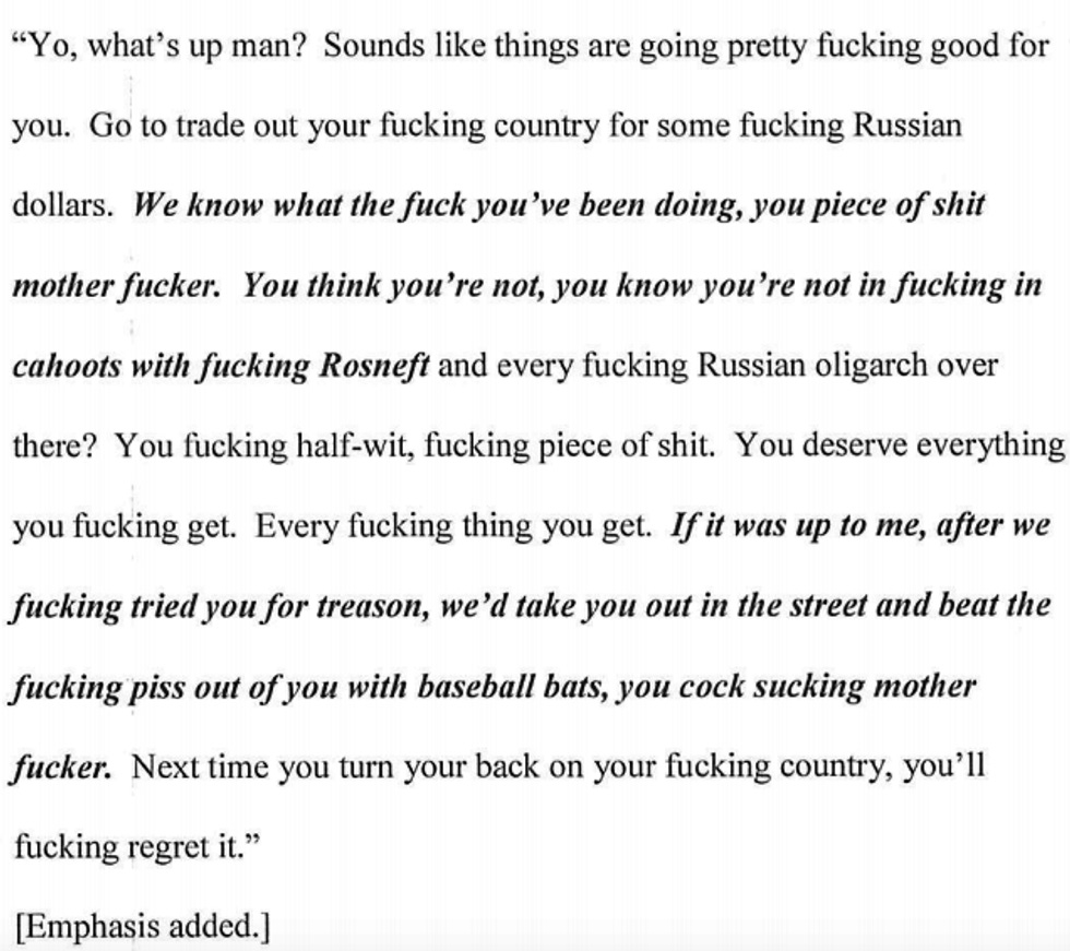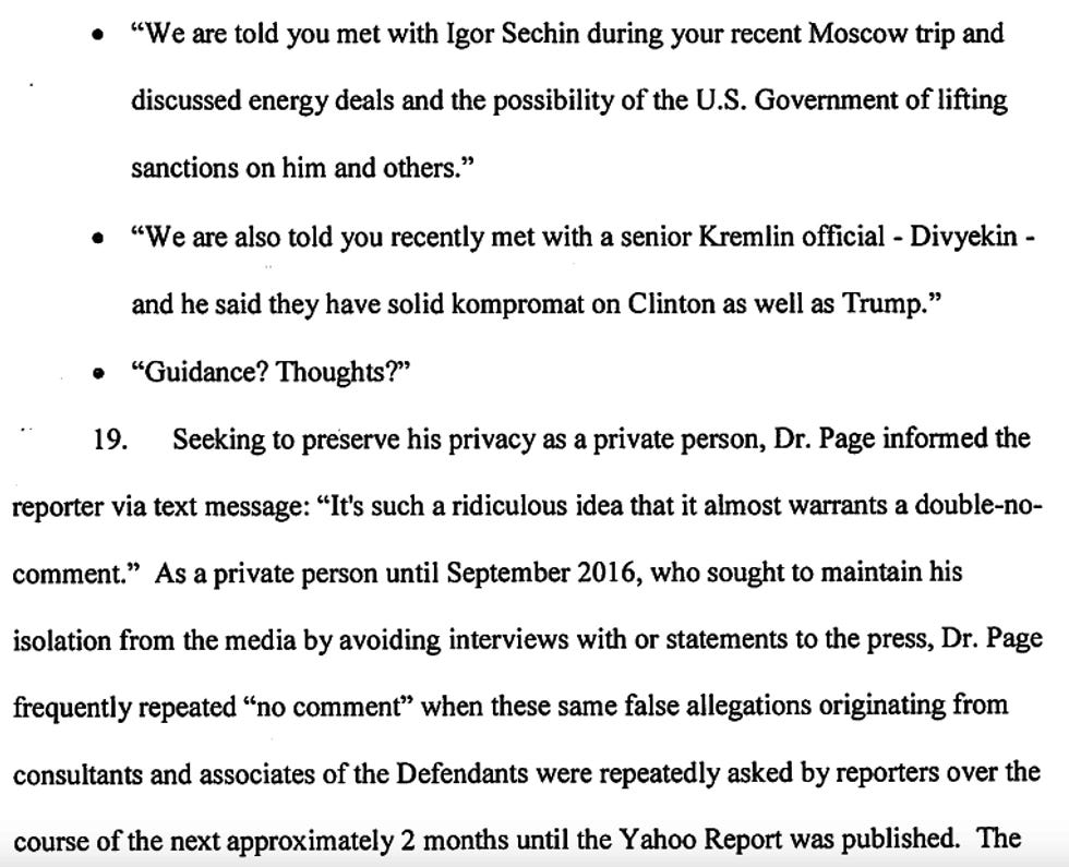 Christopher Steele got some names wrong in The Dodgy Dossier, and then the DNC said that Carter Page was trying to earn a multi-million dollar commission on the sale of Rosneft by talking to a different Russian from the actual Russian he was trying to do business with, and then Yahoo printed it, and then Carter Page suffered "life-threatening damages" like this mean phone call.