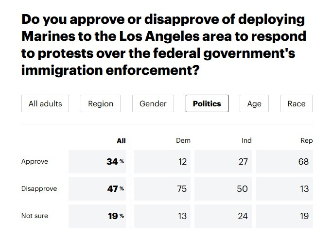 And despite the screaming that immigrants are the worst of the worst, Americans who aren’t already onboard the Trump Fascism Train don’t appear to be buying it: New polling today from YouGov shows that 47 percent of Americans disapprove of “deploying Marines to the Los Angeles area to respond to protests over the federal government's immigration enforcement,” while only 34 percent support it. The partisan divide is right there, too, as you’d expect: