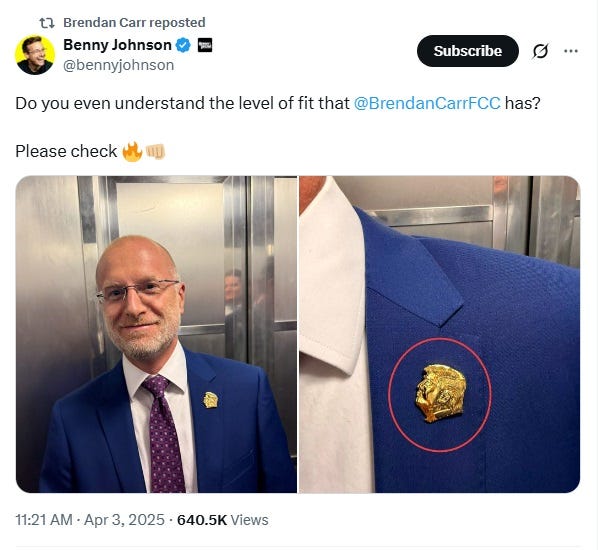 For instance here’s FCC Chair Brendan Carr sporting the Gilded Rage on his suit, as twote last week by rightwing loon Benny Johnson, who was impressed in a very manly way, asking “Do you even understand the level of fit that [FCC Commissioner Brendan Carr] has?”