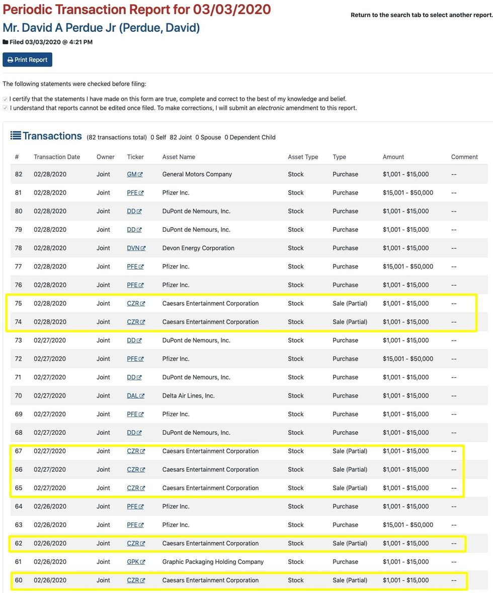 Here's David Perdue — the other GOP senator from Georgia — makin' some sales (Caesar's, the casino not the pizza company, HUH!) and makin' some buys (Pfizer, HUH!), but of course these were at the end of February, when the market had already started going loopy (click on tweet to embiggen):