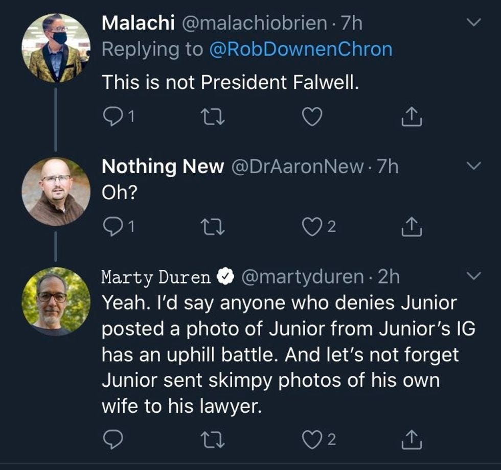 As Relevant magazine reports, soon after the picture of Jerry's Great Big Upper Pubic Mound started going around, Malachi O'Brien, a fellow of the Falkirk Center think tank Jerry Falwell and Turning Point USA dork Charlie Kirk started in their mom's basement, tweeted about how that was def not Jerry's Upper Pubic Mound: