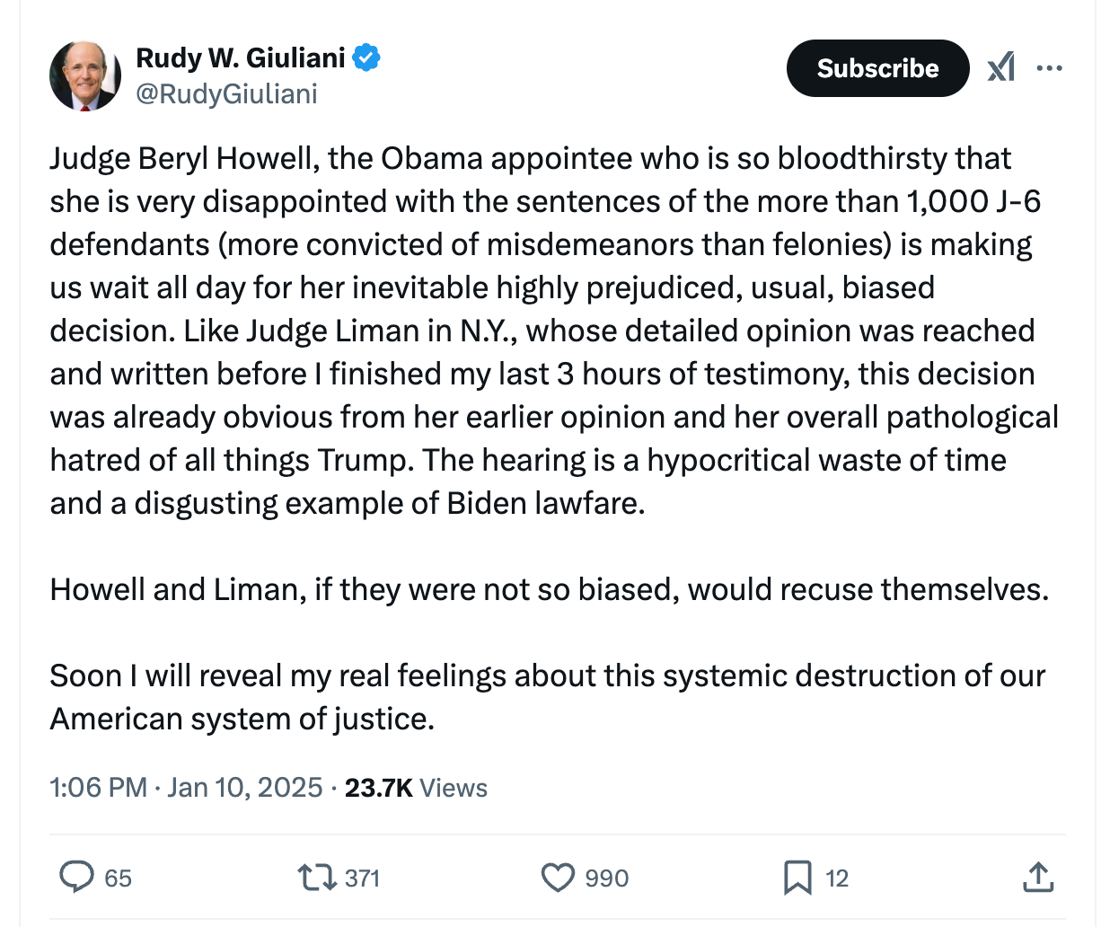 “It is outrageous and shameful that Mr. Giuliani dares to suggest that he is the one being treated unfairly when he heard the evidence at trial. This takes real chutzpah, Mr. Giuliani!”