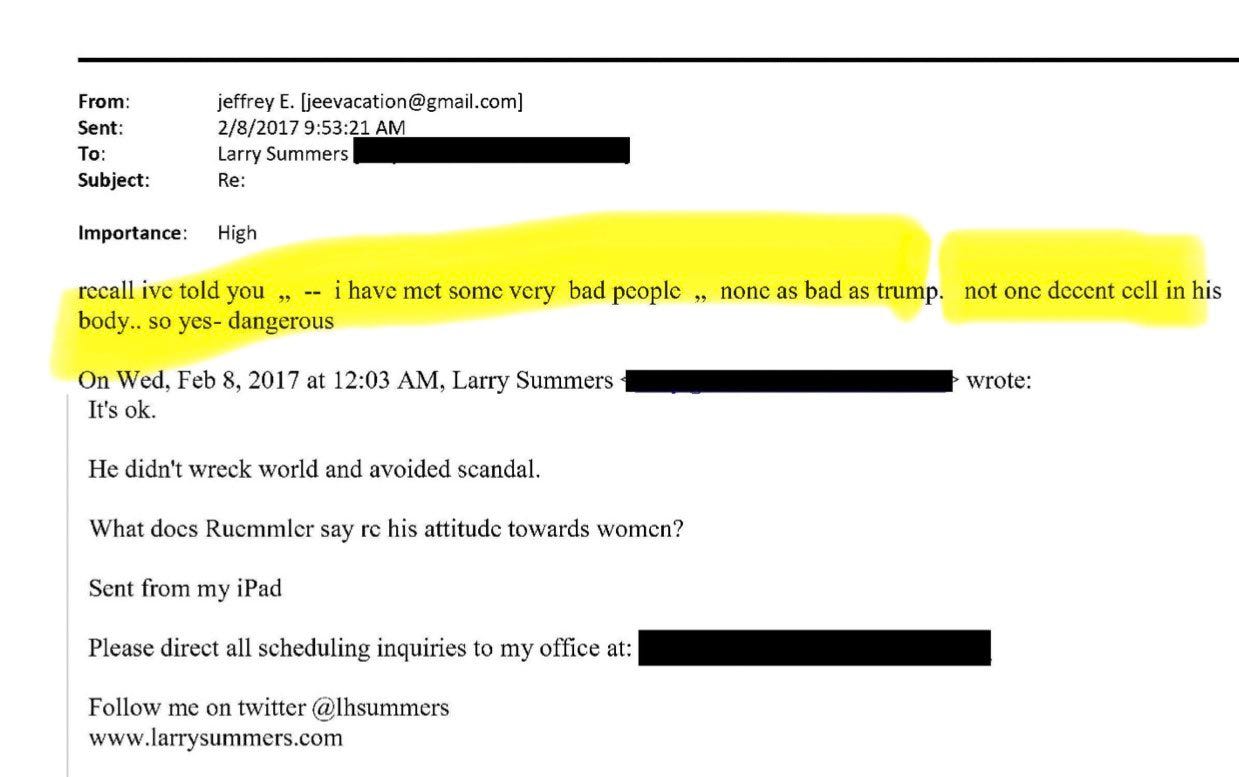 It’s [sic] throughout, obviously, but, Trump’s pedophile best friend said to Larry Summers in February of 2017: