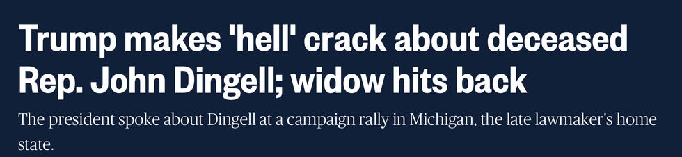The president didn't just "speak about" John Dingell. He put him in the same living facility as Stalin. And his widow, who has a name, didn't "hit back." She just said "ouch." The media insists on framing Trump's personal attacks as equal-opportunity "feuds." NBC NewsdescribesTrump's gross comments as a "'hell' crack" and a "macabre quip." This actively spins Trump's cruelty as envelope-pushing "comedy." If the Senate actually removes him from office, maybe Netflix can give him a comeback special. Trump is not a "funny guy." He's not a "fighter," either. He's just a bully.