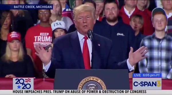 Donald Trump never runs out of ways to make us sick. During his banana pants rally last night in Battle Creek, Michigan, the freshly impeached president attacked Rep. Debbie Dingell, who'd voted to bounce him from office and fumigate the White House afterward. Trump considered her vote a betrayal because he'd done the bare minimum expected of a president when Dingell's husband died early this year. John Dingell Jr. was the longest-serving member of either house of Congress. He worked to pass Medicare, Medicaid, the Civil Rights Act, the Clean Water Act, the Endangered Species Act, and the Affordable Care Act. He also was a bone-spur free veteran of World War II. Trump insulted his memory in the state he'd served faithfully for decades without ever once being impeached.