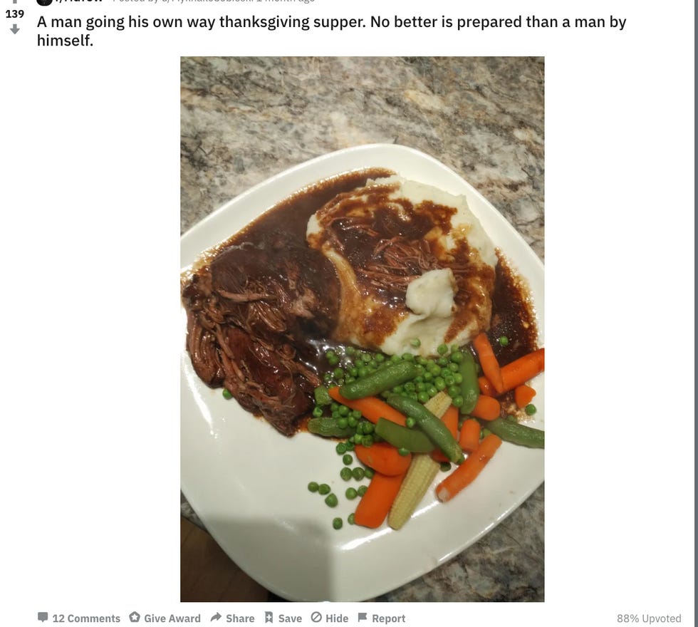One MGTOW, for whatever reason, decided to "prove" that women who cook Thanksgiving dinner and act like it's a big deal are lying liars and claims that he did a whole turkey plus many sides... for himself. I'm not going to post the whole thing , because it is boring, but here is his conclusion: