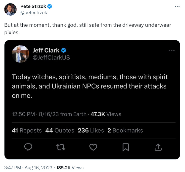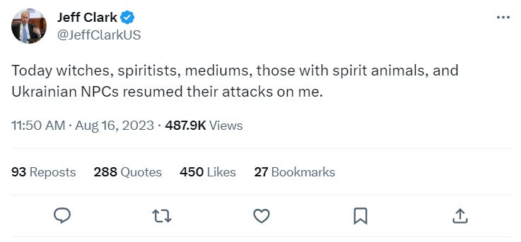 In summary and in conclusion, it is just scientifically true that witches and spiritists and mediums and people with spirit animals and Ukrainian NPCs are secretly plotting to do all manner of nefariousness to Jeffrey Clark, and he can run and he can hide, but they will find him, because they always win.