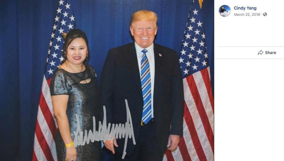 That photo was captured by the Miami Herald before Yang deleted her Insta. Seats and a photo at the March 3, 2018, Trump-Pence campaign fundraiser went for $50,000 per couple.