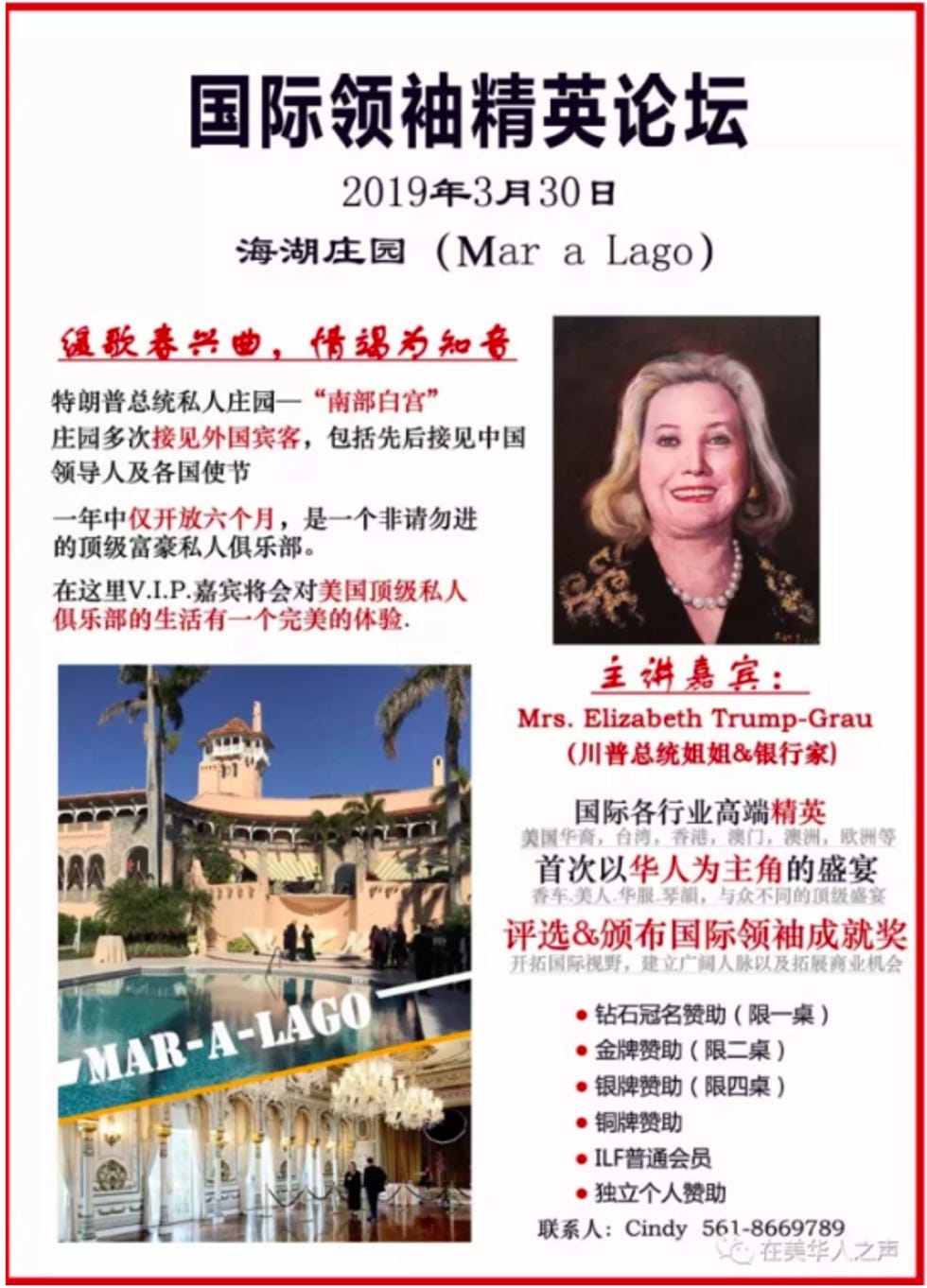 You gotta spend money to make money, though. And Mrs. Yang used that photo to flog her services connecting Chinese business people with Trump and his family. Here's an ad captured by MoJo, before the GY US Investments website disappeared, advertising access to the "International Leaders Elite Forum" on March 30 with Donald Trump's sister Elizabeth Trump Grau.