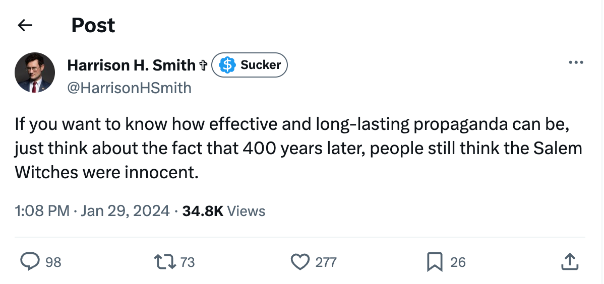 “If you want to know how effective and long-lasting propaganda can be, just think about the fact that 400 years later, people still think the Salem Witches were innocent,” he wrote. Yes, just think about that, indeed. Think about it. Roll it around in your head. The idea that the propaganda was on the side of the accused witches.