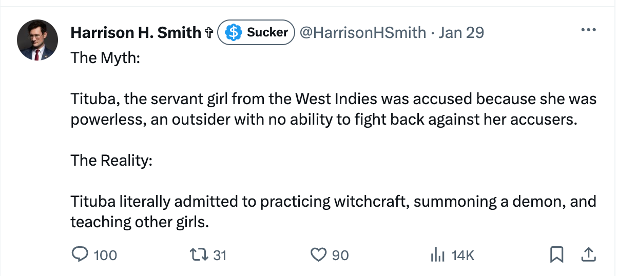 “The Myth: Tituba, the servant girl from the West Indies was accused because she was powerless, an outsider with no ability to fight back against her accusers,” he wrote, adding, “The Reality: Tituba literally admitted to practicing witchcraft, summoning a demon, and teaching other girls.”