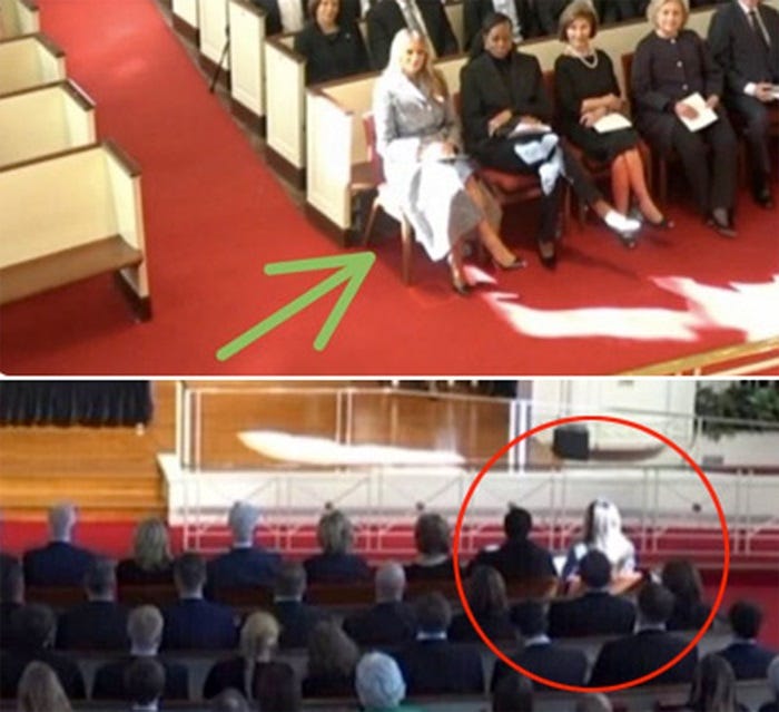 And then there’s Alex Jones’s InfoWars, whose coverage pointed out that only Satanists wear black to a funeral, whereas Melania was singled out for attention by God, who arranged for some light from the windows at Glenn Memorial United Methodist Church in Atlanta to fall on her, and her alone, with some slippage, during one part of the service. We have not altered a single bit of this screenshot: