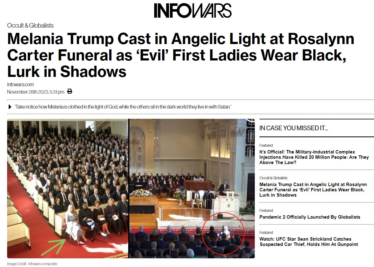 Under the subject heading “Occult & Globalists,” the headline proclaims, “Melania Trump Cast in Angelic Light at Rosalynn Carter Funeral as ‘Evil’ First Ladies Wear Black, Lurk in Shadows.” (“Evil,” is a quote from one of the many tweets in the story, not necessarily the judgement of InfoWars, wink-wink.) Just to make sure readers get the point, the story’s subhead quotes another tweet that said “Take notice how Melania is clothed in the light of God, while the others sit in the dark world they live in with Satan.”