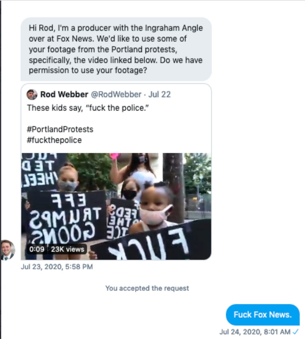 Of course, while we find that darling, it would also enrage the crap out of Fox News viewers. And that is very likely why Webber was soon contacted by Mike McDonald, a producer from "The Ingraham Angle," about using his footage on air.