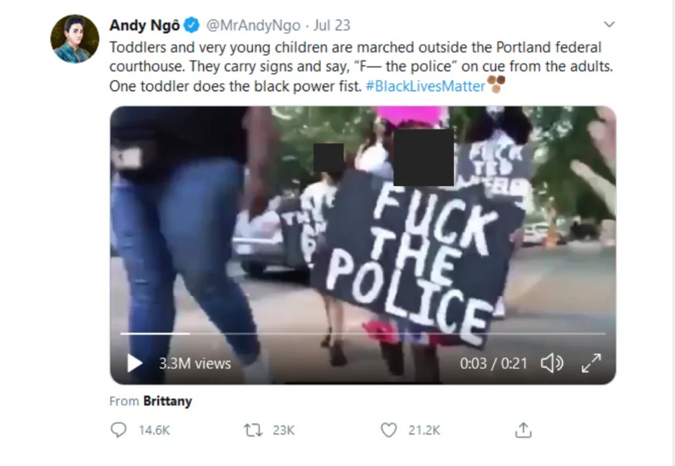 They have done it knowingly, and willingly. Between Fox and Andy Ngo, they have caused the video to be shared with a misattribution to hundreds of thousands. The video has received 3.4 million views off of Andy alone— and it has been shared by Senators, Governors, and the dim-wit President's son.