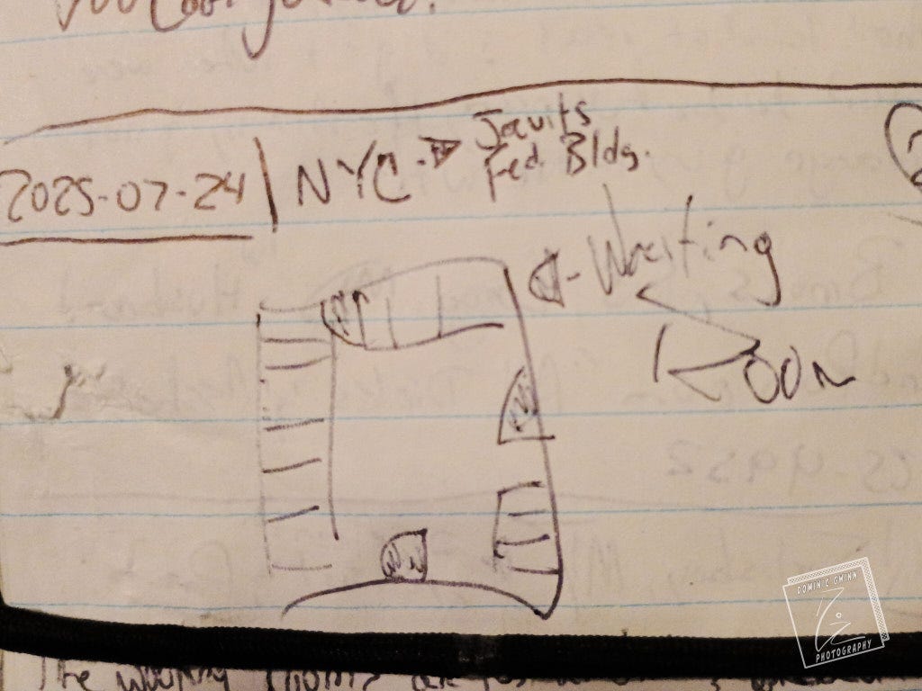 Starting at 8 a.m., people classified as non-citizens of the United States start lining up on Broadway. They all have a piece of 8x11 paper. A court summons. Some carry folders, weathered attaches, or those cheap, brown accordion-style document holders. Nobody looks very enthusiastic.