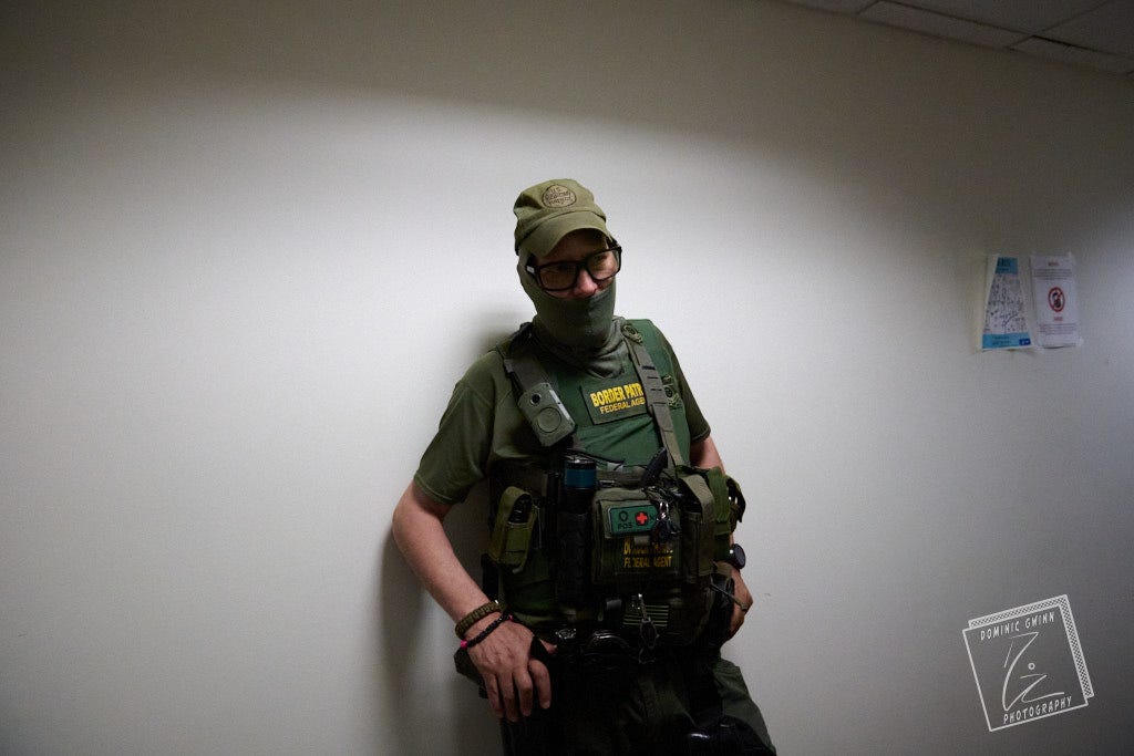 “Second I heard about this,” says one masked agent wearing an ill-fitting green CBP uniform. He snaps his fingers and says, “Mmmm!”