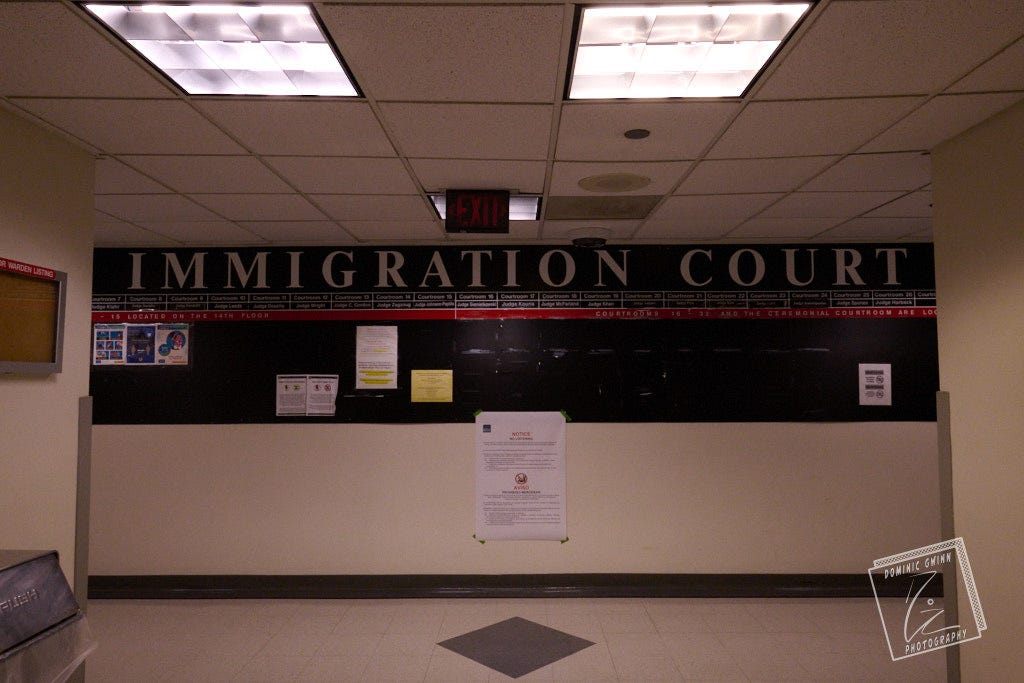 Immigration court is on floors 12 and 14. A large, unfriendly banner reading "IMMIGRATION COURT" greets you upon stepping off the elevator. From there, you wait inside a small, windowless room with about a dozen chairs. There's nothing special about the drab room. The walls are a pale cream, like a soured milk. There are three large, heavy doors. One leads into the room, another to the judge. The last one never opened.