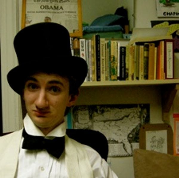 SAY GOOD-BYE TO JULI & HELLO TO RILEY: Our beloved internJuli Weiner has left us for new assignments, at both the New Yorker and N+1 . Really. We hope to see her back again in Wonkette-land, eventually. But now it's time to meet your highly qualified Summer 2009 Wonkette intern, Riley Waggaman.He hails from Wheaton College, but "not the crazy one in Illinois." And he is the owner of this historical gossip-columnist top hat, which means he'll be doing our new Washington Gossip Column, which we still need to name. (Riley will really be going around DC in this hat, to get the Hot Gossip!) You can help us name this new feature, in the comments! Winner gets a classic Wonkette Operative T-shirt, if said winner can convince Newell to hand it over.
