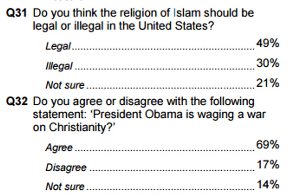 The other "kill" from this poll, though it's not related to the candidates, is Islam, apparently. Yes, the very same wingnuts who are bitching and moaning about RELIGIOUS FREEDOM!!!!1111!! and all that bullshit ... well, not even 50 percent of them know that OF COURSE Islam should be legal in America because it says so right in the First Amendment they're always blathering about. Meanwhile, 69 percent say President Obama is DEFINITELY "waging a war on Christianity." Yeaaaaaaah, these are fuckin' morons, y'all.