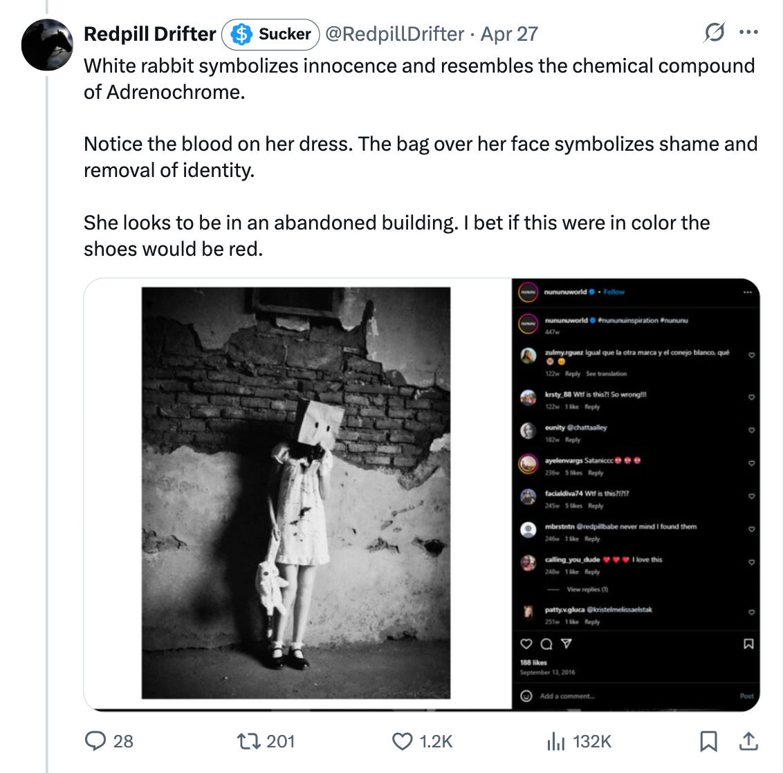 Can you just picture the photographer coming up with this though? “Yes, so I want the girl in the bloody dress (that is actually just a paint splatter dress in a black and white picture) to hold a stuffed rabbit, because innocence and adrenochrome.” Is that what they think happened?