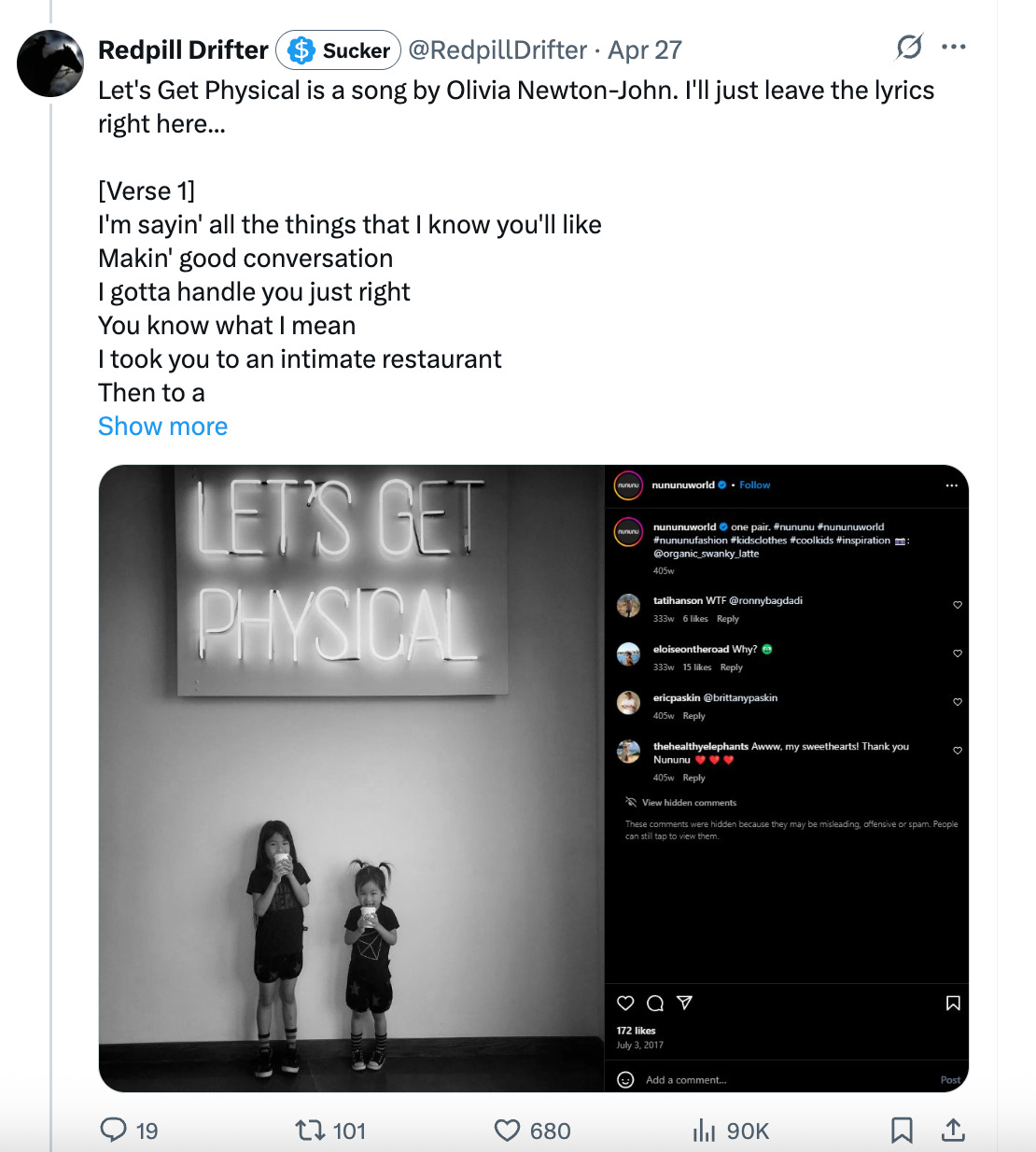 It is not clear how or why NU would stand for New World Order. Is it because it’s “UN” backwards? It seems more likely that this was just something Redpill Drifter pulled out of their ass, much like they assumed that NUNUNU was Celine Dion’s personal clothing brand, which it is not.