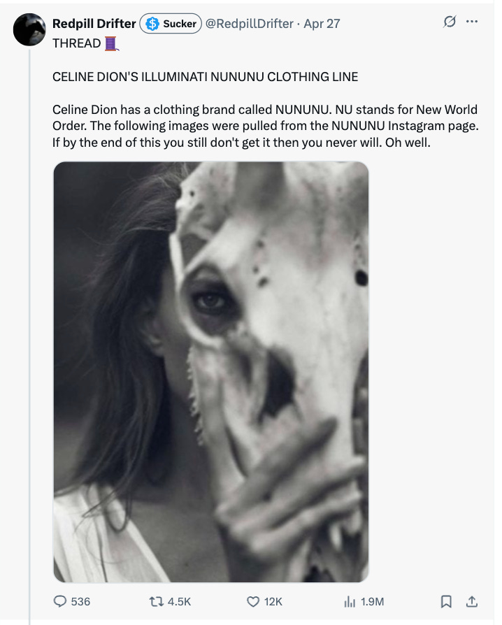 “Celine Dion has a clothing brand called NUNUNU. NU stands for New World Order. The following images were pulled from the NUNUNU Instagram page. If by the end of this you still don't get it then you never will. Oh well,” they write. Spoiler alert, we’re not going to get it.
