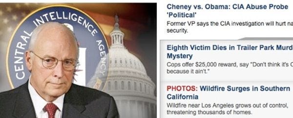 Major discovery in the 2004 CIA inspector general's report on torture for which ABC News gets sole credit, MUST GIVE THE CREDITS TO ABC NEWS: Dick Cheney is secretlyJesus. This is why he wears the Golden Jesus Halo Crown of the CIA! Also: That second story? It's Dick Cheney. And we'll take our $25,000 "Ensign Style," in three separate checks, to avoid declaring it as income. [ABC News ]