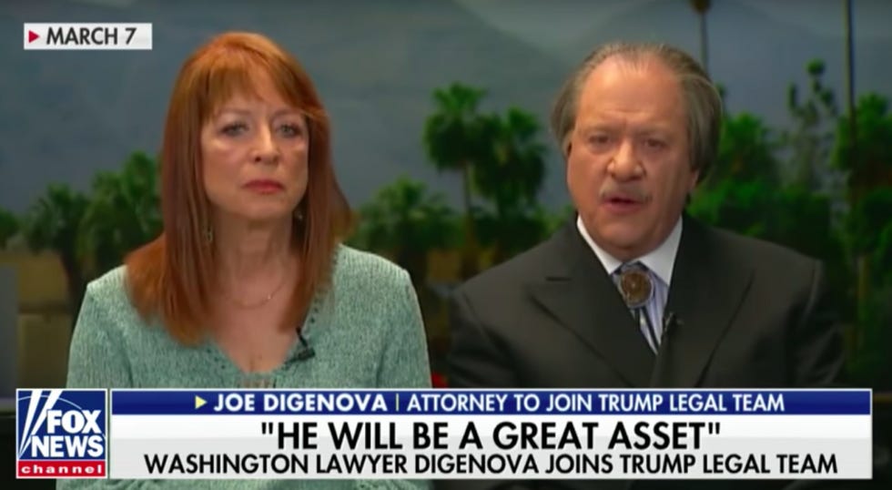 On Monday, Trump announced that he'd hired noted Fox News crank Joe diGenova to take on Robert Mueller. At which point his prior lawyer John Dowd noped out -- he did not spend decades practicing in DC to play second fiddle to the My Pillow Guy. But by Sunday, diGenova and his wife Victoria Toensing were packing up their bag of conspiracy theories and heading home, having lately discovered they had "conflicts."