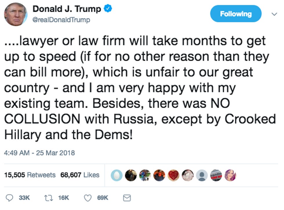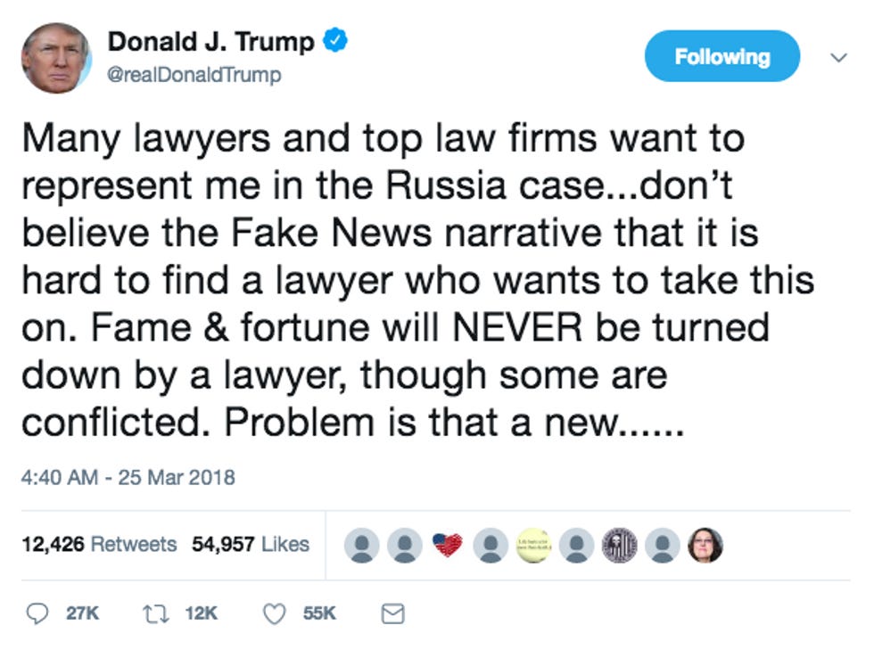 LOLOLOL! President Credibility Gap is tweeting again after yet another high-profile attorney announced he'd be washing his hair for the duration of the special counsel's investigation. So weird that nobody wants to work for a guy who tweets out that lawyers are just fame whores, right?