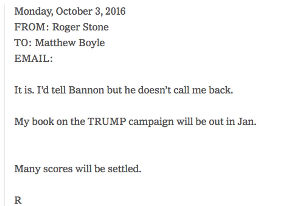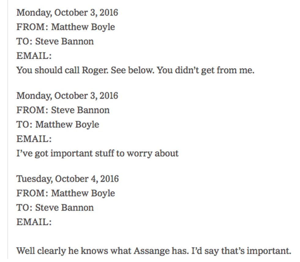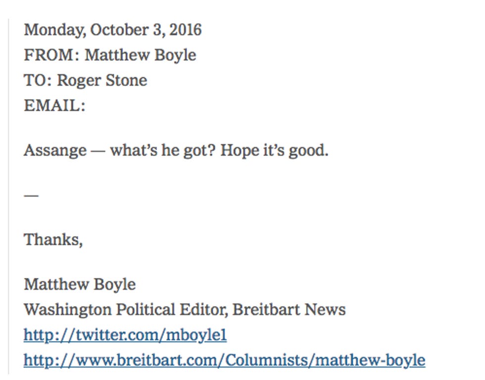 In any event, the Breitbart flunky raced to tell Bannon that Stone had the Wikileaks hookup.