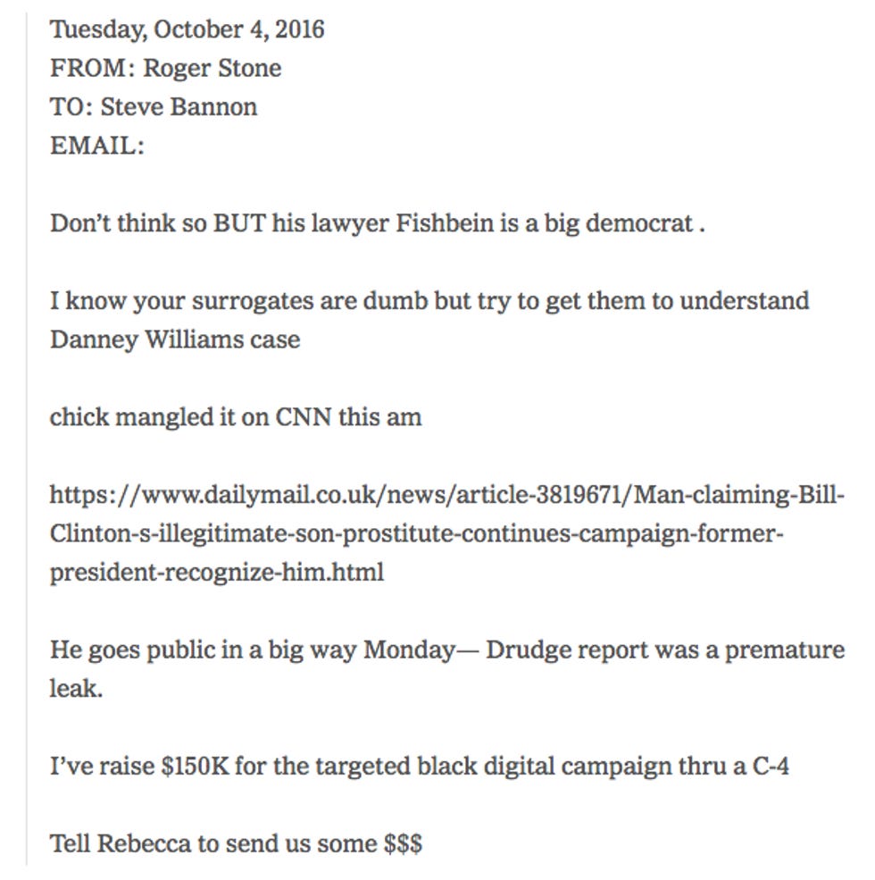 We're having a really hard time believing that Roger Stone is the linchpin of any grand conspiracy though. For one thing, he didn't seem too interested in Assange's documents, reverting to the illegitimate baby story as soon as he got Bannon's attention.