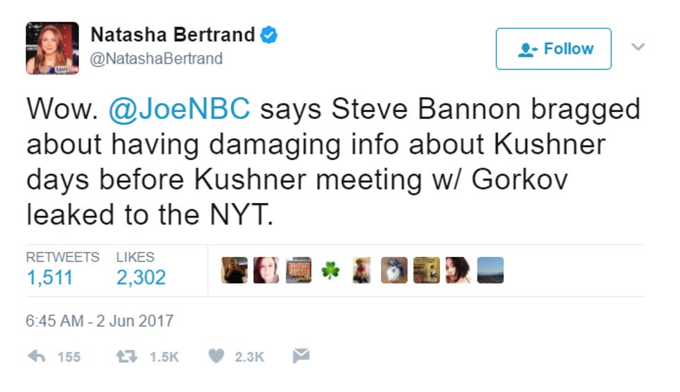 HMMMMMM! The New York Times scoop he's talking about came from the last week of March, when it reported that during the transition, Jared had met with Sergey Gorkov, head of the Russian state-owned VneshEconomBank (VEB), which is under U.S. sanctions stemming from Russia's invasion of Crimea. Jared failed to disclose that meeting! By the way, that news came out just a week or two before we learned Bannon called Jared a "cuck." Interesting timing!