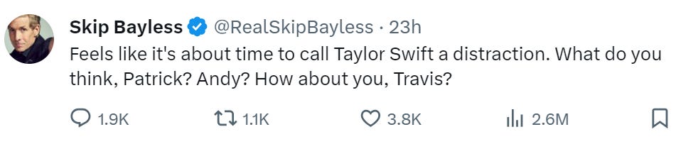 Is Taylor Swift the Yoko Ono of the Kansas City Chiefs? Such is the great question that has consumed sports-loving, clout-chasing idiots of the Right since the defending Super Bowl champions got their butts kicked on Christmas Day by the Las Vegas Raiders: