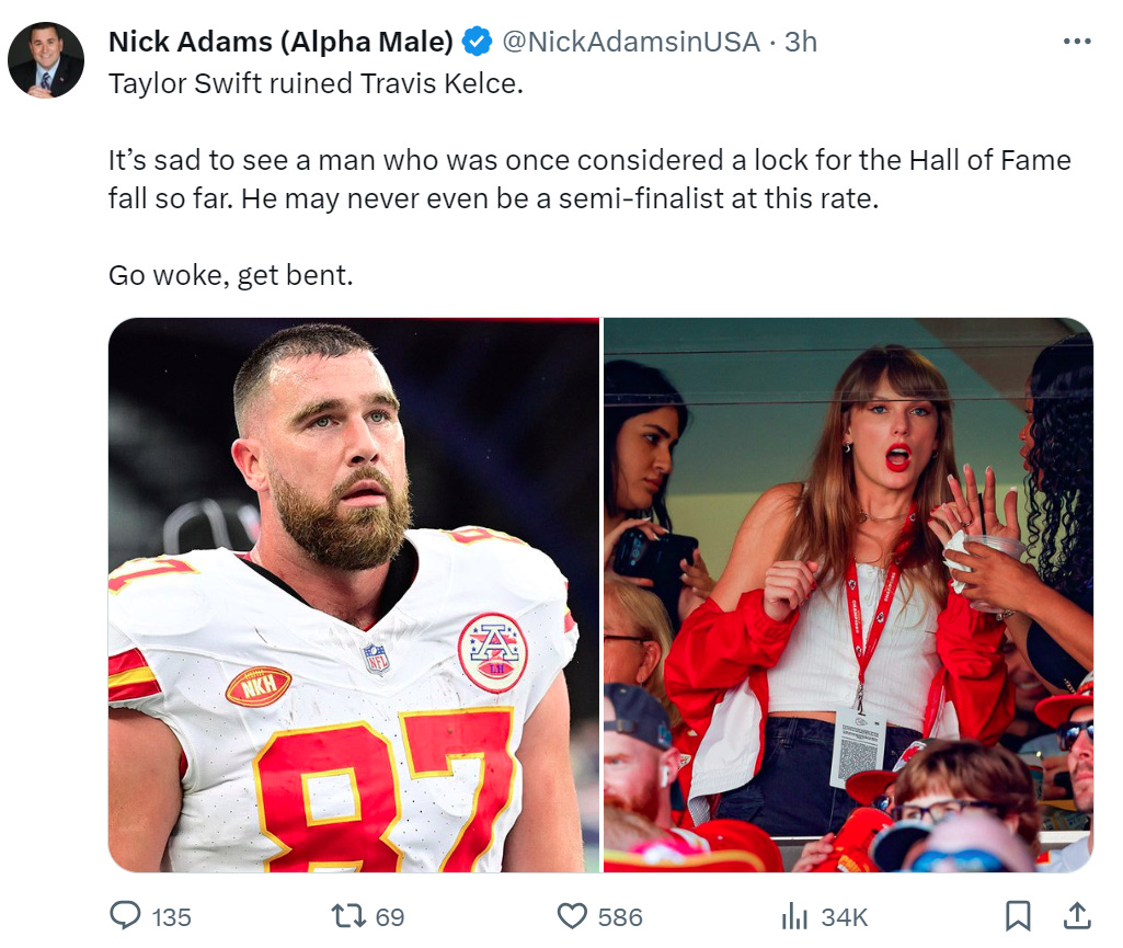 That Kelce is “woke” because he has done TV commercials encouraging people to get their COVID shots is an article of faith on the Right. His girlfriend being a liberal who tells people to vote probably also does not help.