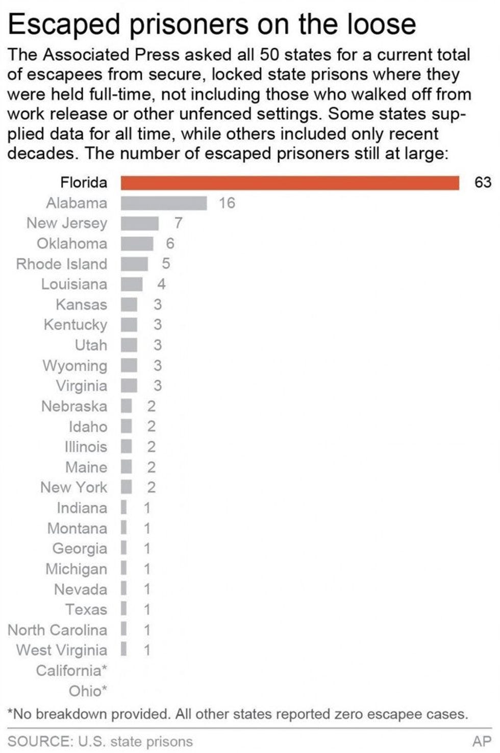 According to a recent study by the Associated Press, there are 63 Florida inmates unaccounted for by the American prison system. That's three times more than the next state to provide data (Alabama) and a proto-Australia-level of convicts just walking around not behind bars.