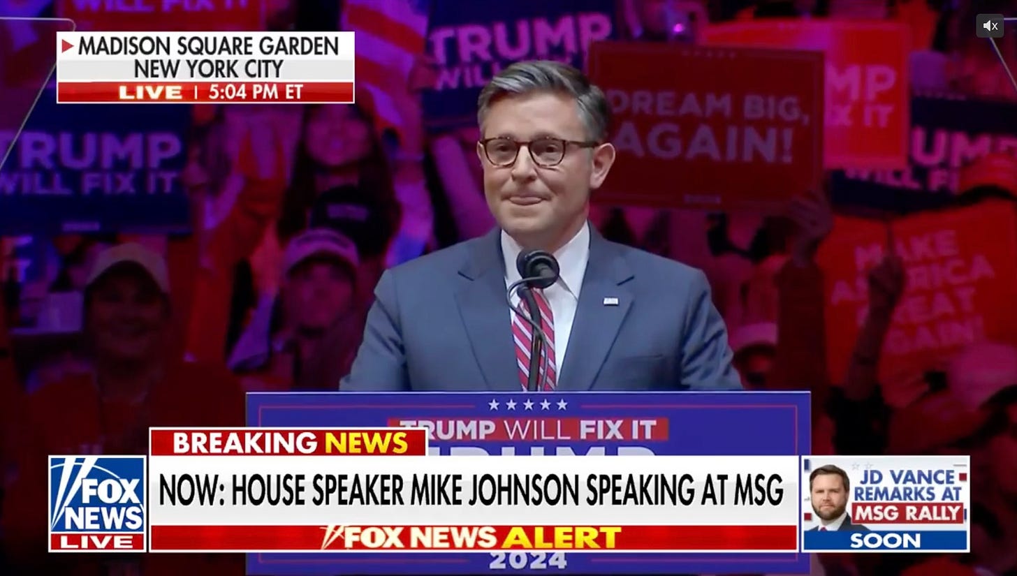At Donald Trump’s Madison Square Garden Hitler hootenanny, one strange and ominous moment hasn’t gotten quite as much chatter as the ass-scorching racism: Trump’s blurbling about how he and House Speaker Mike Johnson have a special secret. “I think with our little secret we are gonna do really well with the House, our little secret is having a big impact, he and I have a little secret, we will tell you what it is when the race is over.”