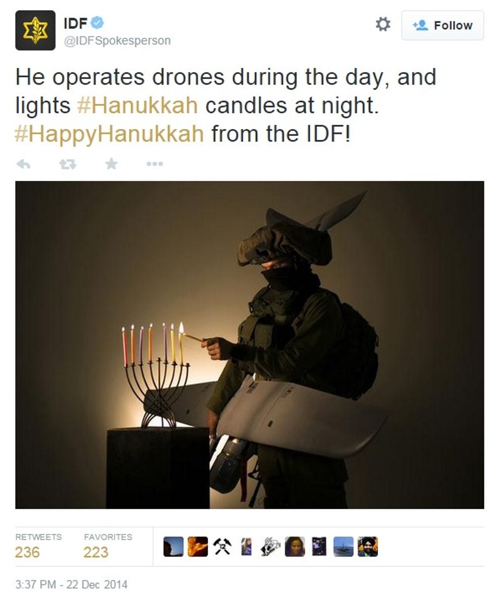 The Israel Defense Forces' official Twitter account brings us this festive holiday image to celebrate the miracle of a Skylark hand-launched surveillance drone staying aloft for eight hours, when it only had enough battery charge for an hour: