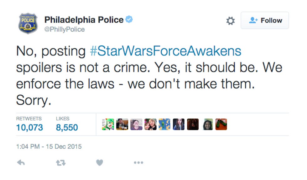Damn straight, Philly PD. And we are not that guy, so we will not spoil your fun, hell no. We are SEXCITED just like you to stand on line for all the many hours, tickets in hand that we purchased months in advance because duh, as we pray along with our fanatic brethren, to the god of our hokey religion, to please please , let this one not suck.