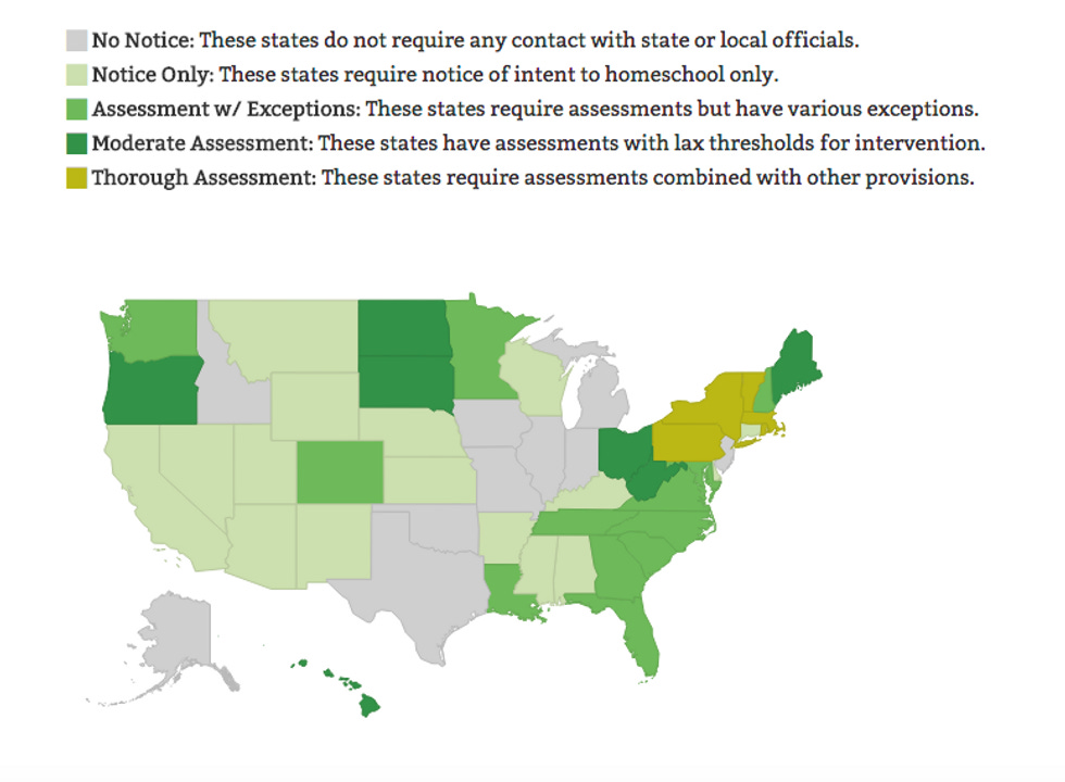 Perhaps even more disturbing is the fact that only two states -- Pennsylvania and Arkansas -- require any kind of background check on parents before allowing them to homeschool their children. Pennsylvania won't allow parents who have been convicted of a number of things within the last five years to homeschool their children, and Arkansas prohibits convicted sex offenders from homeschooling -- which should really be the bare minimum.