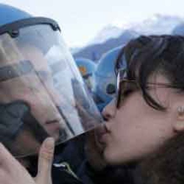 This horrible sexual violencer, Nina de Schiffre, was protesting a bullet train from Milan to Paris, so she is probably an Italian Tea Partier, we are guessing, since the protests seem to be a mixed-up jumble of "anti-austerity" and "anti-tax" and other nonsense that would not be on the same side of one protest here in US Amercia where things make sense. Anyway, this presumed Tea Partier type person went and kissed a po-po on his plastic noggin, and now she is being charged with sexual violence, like we already said, and also the police are threatening to take away the divine right of protests. But one hero copper isn't scared!