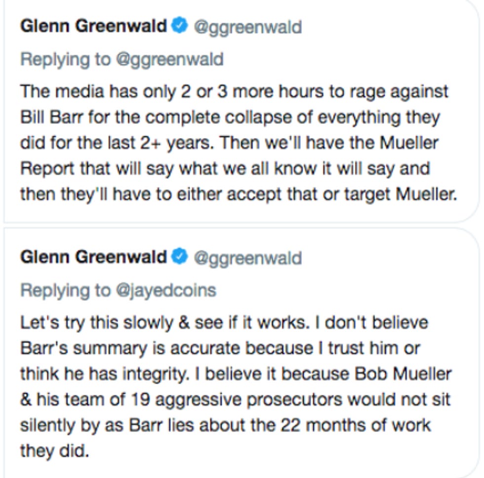 The denouement of that particular episode of Glenn Greenwald setting fire to his own foot, using his flaming foot to kick himself in the dick, and then eating both foot and dick with whipped cream and rainbow sprinkles, came the very next morning, when we read Mueller's actual letter for ourselves, which mentioned nada not shit about the media. And of course, we are skeptical that Mueller wrote one thing in his letter, and then changed course entirely and instead bitched on the phone to Barr about the media getting it wrong, and why? BECAUSE WE'RE SMARTER THAN A COMMON GLENN FUCKING GREENWALD.