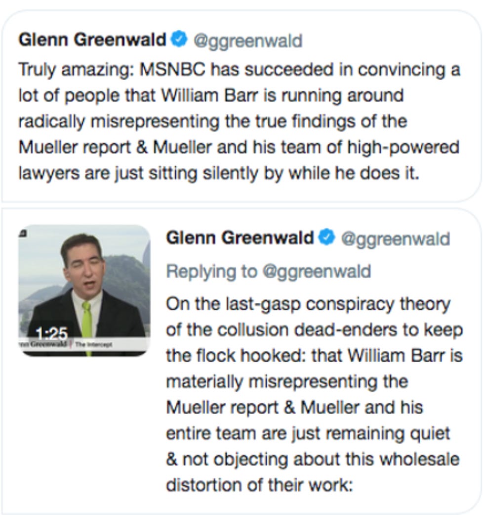 And then, you know, we learned in the newspaper about the letter from Mueller to Barr, where he excoriated Barr for mishandling his work. And we read the news reports suggesting, based on what DoJ sources whispered in New York Times reporters' ears, that actually Mueller was just mad because the media was misrepresenting his work, and wasn't mad at Barr really at all! And we were skeptical, because we are smarter than a common Glenn Greenwald and have gotten pretty good at identifying when the Times is mainlining anonymous quotes from bullshitting DoJ sources.