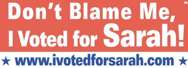 Rich car-owning operative "Amanda" sends notice of the latest terrible decoration that the monsters are swapping around: "Hi, I'm a longtime reader living in Gainesville, FL. Driving around town this morning, I sat at a stop light behind a woman in a white Mitsubishi with the bumper sticker 'Don't Blame Me, I Voted for Sarah!' with this website on it: http://ivotedforsarah.com." It's funny because "Palin voters" can STILL BE BLAMED FOR EVERYTHING. But you really should visit this bumper sticker's website; we promise that there aren't any "biggest fucking hi-res pictures of Sarah Palin ever" on the front page. [ I Voted For Sarah ]