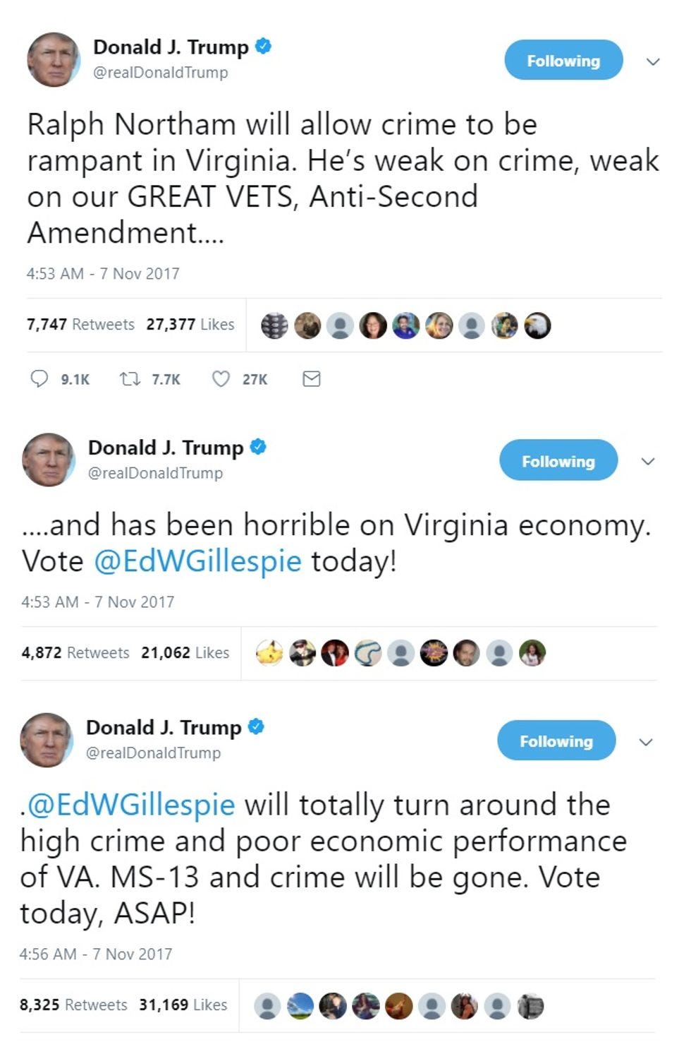 Ed Gillespie, who for his entire political career has been a boring establishment Republican, has been doing his damnedest to run a Trumpian campaign full of culture-war issues to fire up the angriest possible voters, without quite inviting Trump himself to come campaign for him. Not that Trump hasn't tried, like that time he lied about Virginia's economy in a Tweet intended to attack Northam, and gave Northam and current Gov. Terry McAuliffe, who's term-limited, the chance to explain Virginia actually has better job growth than the national average. Trump was at it again this morning, of course, explaining that if Northam wins, he'll invite all the murderous drug gangs to tea at the governor's mansion: