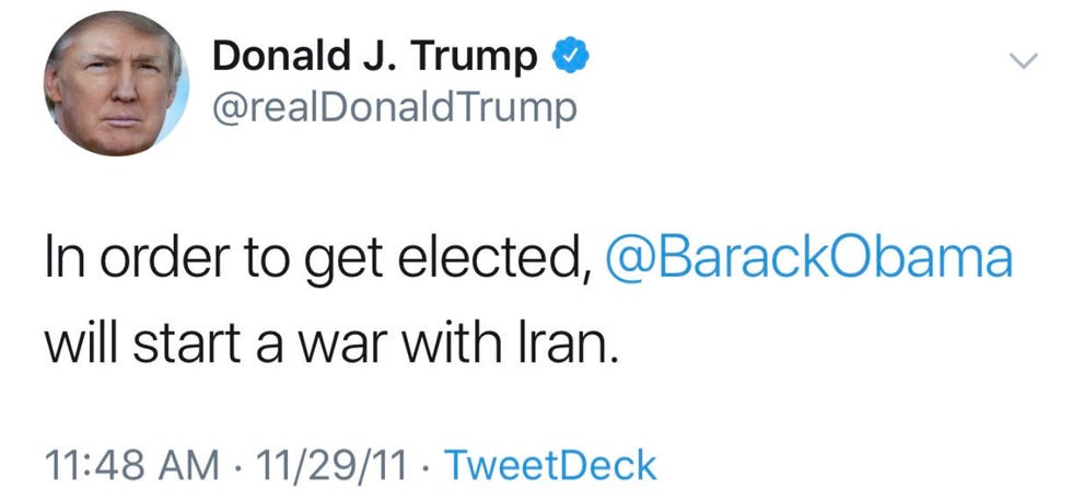 What did we say this morning? Something about how "They want a war with Iran," and "Please do not listen to news reports about Trump telling his people to cool their jets with the Iran talk, because they want a war with Iran, and all they are looking for is their trigger"?