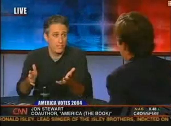 "I wanted to come here today and say... Here's what I wanted to tell you: Stop. Stop hurting America." It was the moment when Jon Stewart definitively transcended his role as just a fake news guy, even as he emphasized that, as a comedian, he had a freedom to use comedy to tell the truth, but damn it, it would be rather nice if those in a position to really inform the public would try that, too: