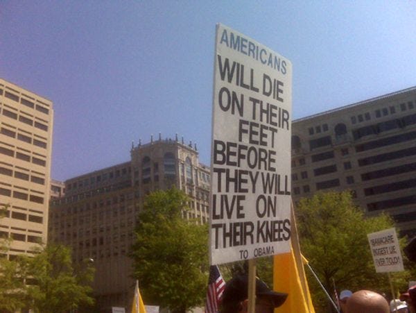 Your Wonkette will be all over town today, taking pictures and carrying signs and just cold goin' nuts, for Liberty! We also invite you to send whatever crazy pictures, videos, whatever. This is exactly like that day when the British torched the White House, so make sure to Twitter about it, to the Library of Congress! FREE THE SHACKLES, and put "Obama" somewhere on the sign, doesn't matter where. [Thanks to Wonkette Operative "Ebeth"]